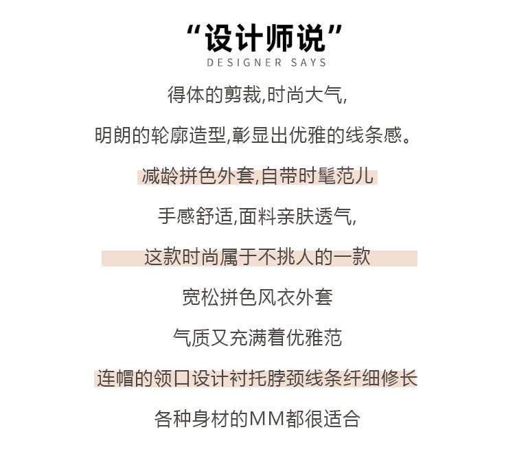 | 流行元素 | プリント、つなぎ合わせ、ポケット、帽子、ファスナー |
