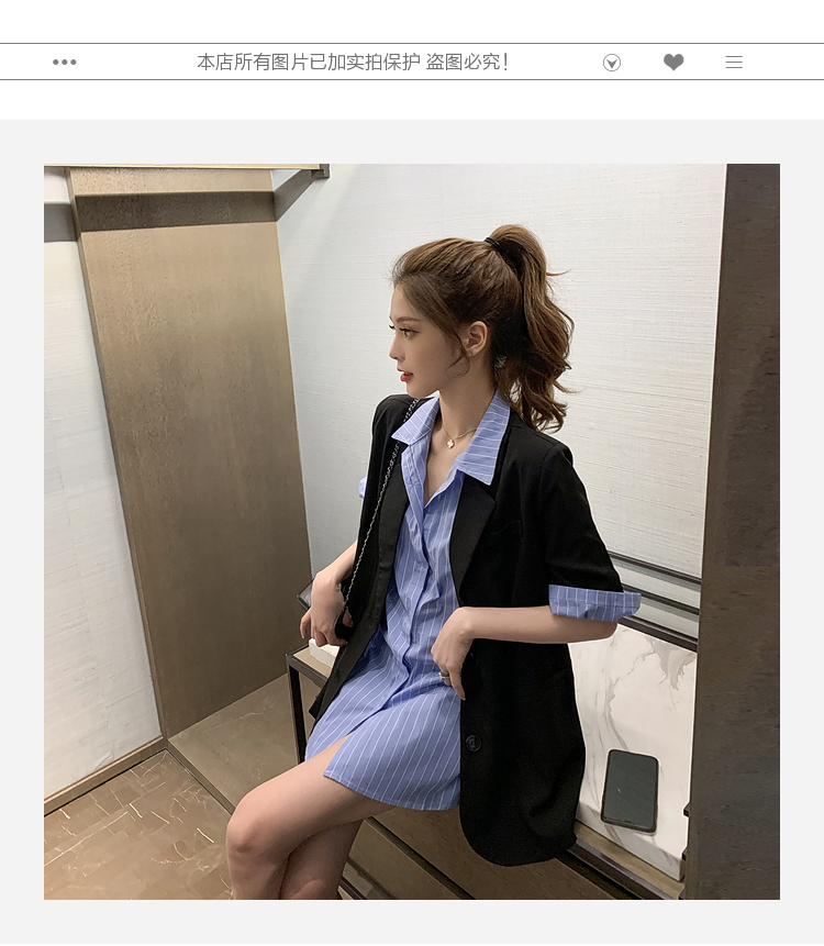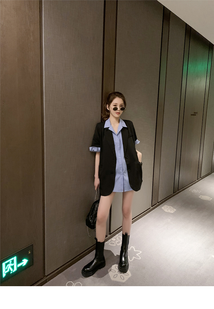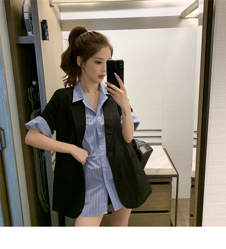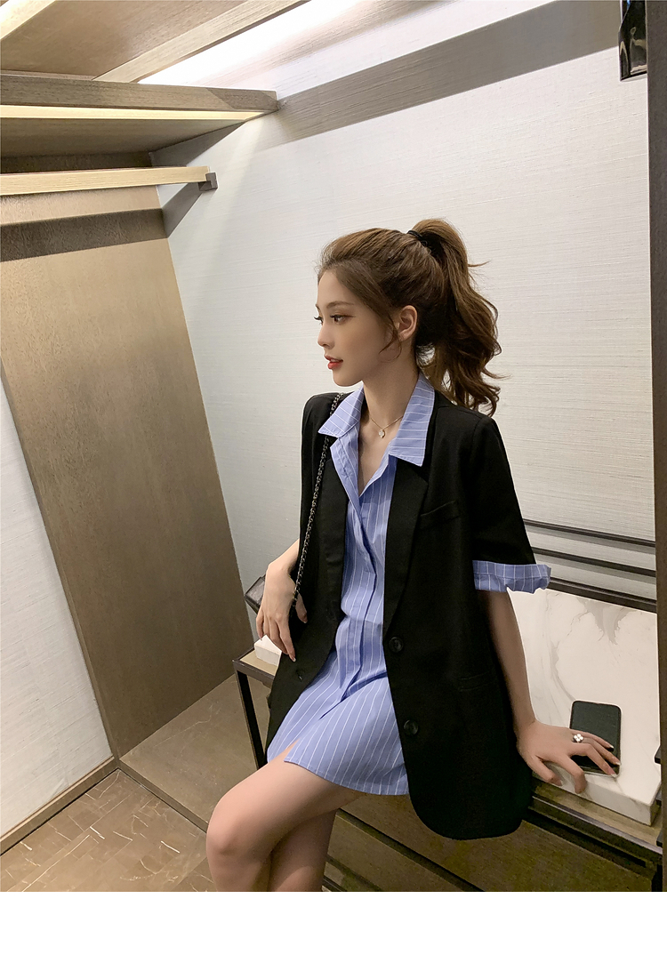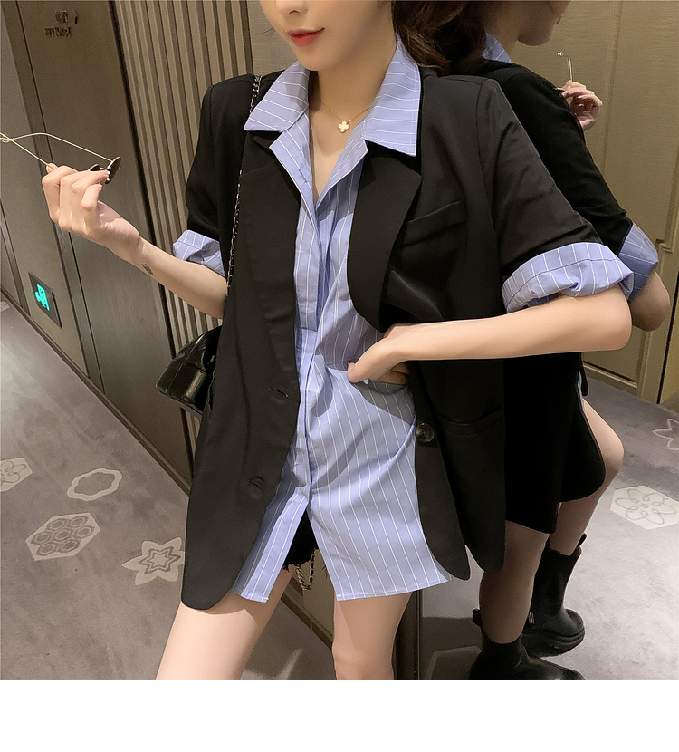 | 商品名 | エメラルドシャツの雰囲気女神様のスーツ夏2020新型ブラックスーツ薄いジャケットにストライプの半袖シャツの二点セット(シャツ+スーツ)M |