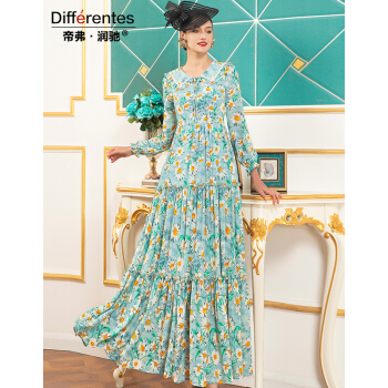 帝弗潤馳2021秋装新着商品法式田園風気質上品ローリングカートト調プリント修身ワンピスグリーン2 XL【写真価格ブランド見積】-