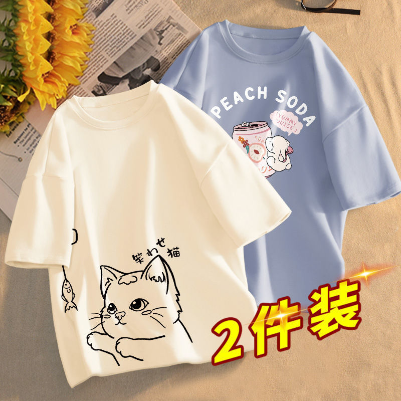 眉梢芙语 2件装网红半袖t恤女2022新着商品印花半袖夏韩版上衣体恤衫Tシャツ女 白(握爪猫标右侧)+浅蓝(抱瓶兔) XXS 50斤以下