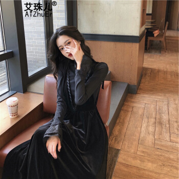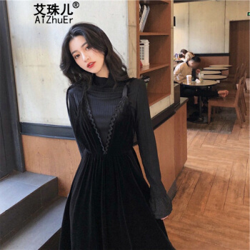 艾珠儿ワンピース女性秋冬2020年新型ビッグサイズ婦人服太ったmm黒い金丝绒ワンピースワンピースワンピースワンピース洋風の減齢で、ウエストが見えてきて、レギンススカートの2つのセットのスカートのボトムス+サスペンダースカートの2 XL